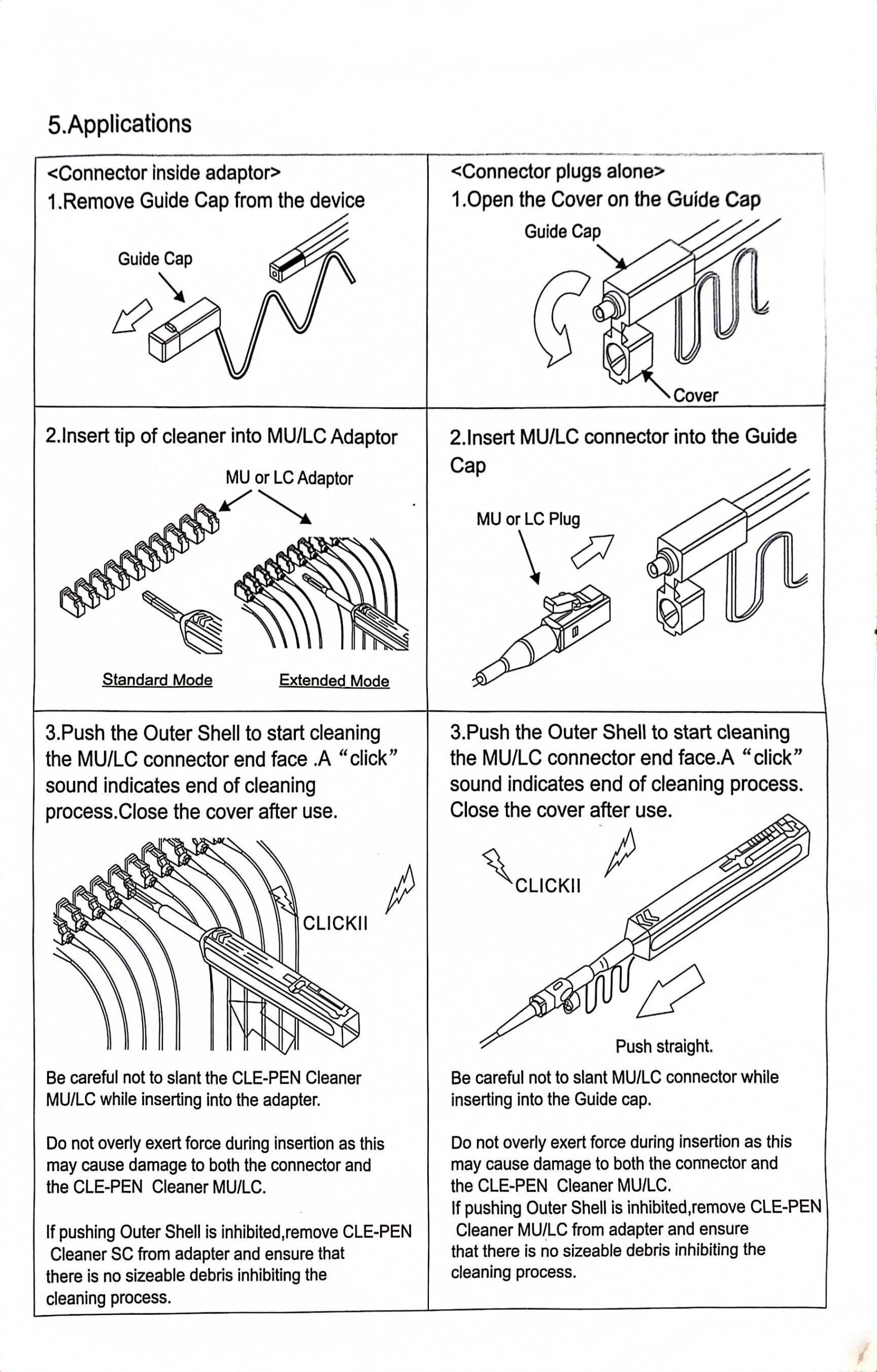 This fiber-optic connector cleaner pen is designed for fast, effective cleaning of multimode fiber connector end faces. It removes dust, oil, and contamination from connectors inside adapters (bulkheads) and from patch cord plugs.