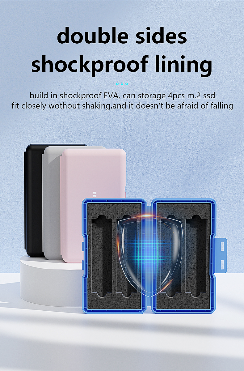 Built to protect what matters. The hard-shell PP exterior is dustproof, waterproof, and moisture-resistant, providing comprehensive environmental protection for your drives. Inside, a double-sided EVA foam lining cradles each drive individually — holding them firmly in place with no rattling or shifting, even if the case is dropped.