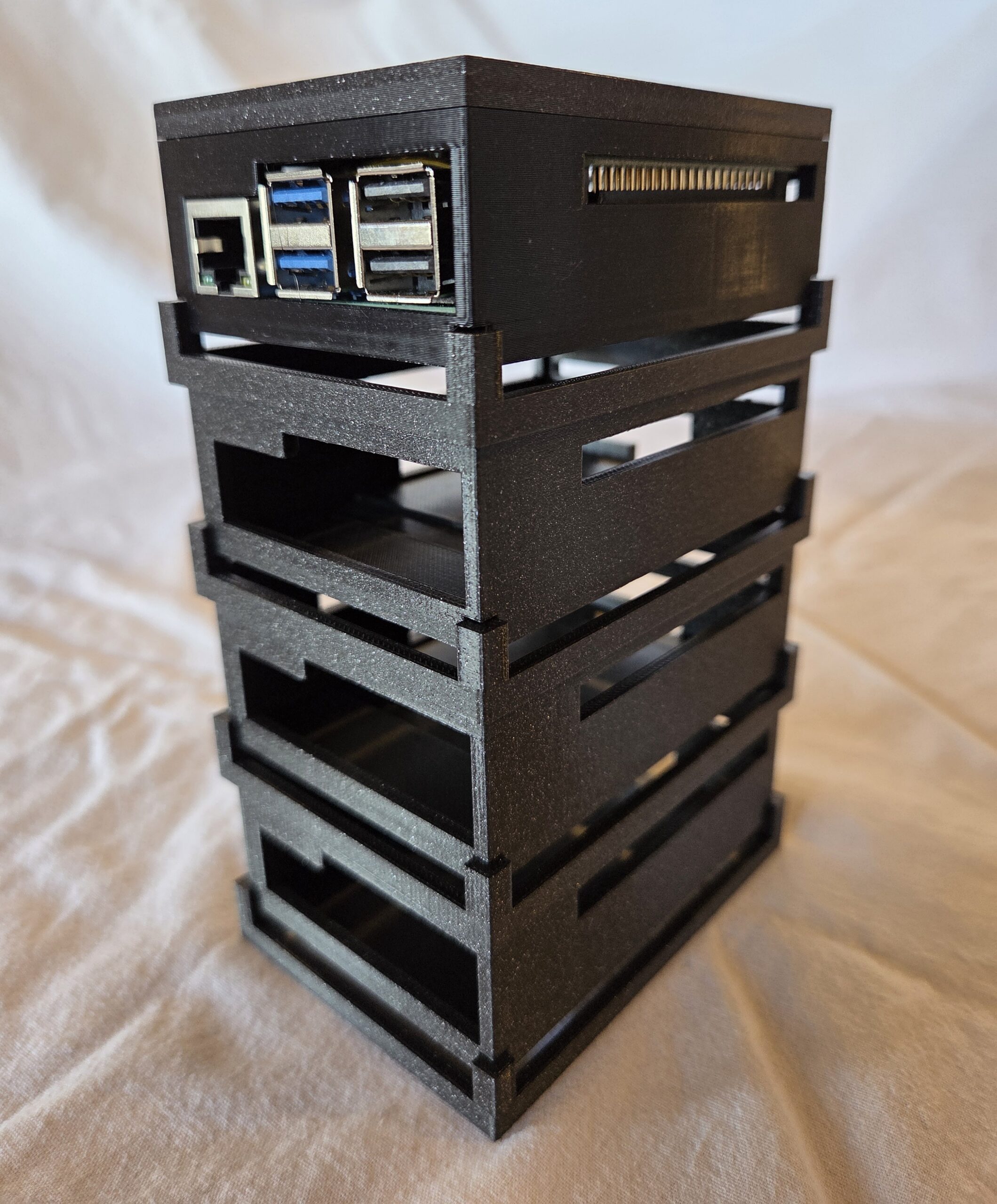 Custom 3D-printed Raspberry Pi 5 case in black PLA. Fits Active Cooler and M.2 HAT+, stackable with optional adapter. This is only the case, purchase Raspberry Pi, Active Cooler and HAT seperately