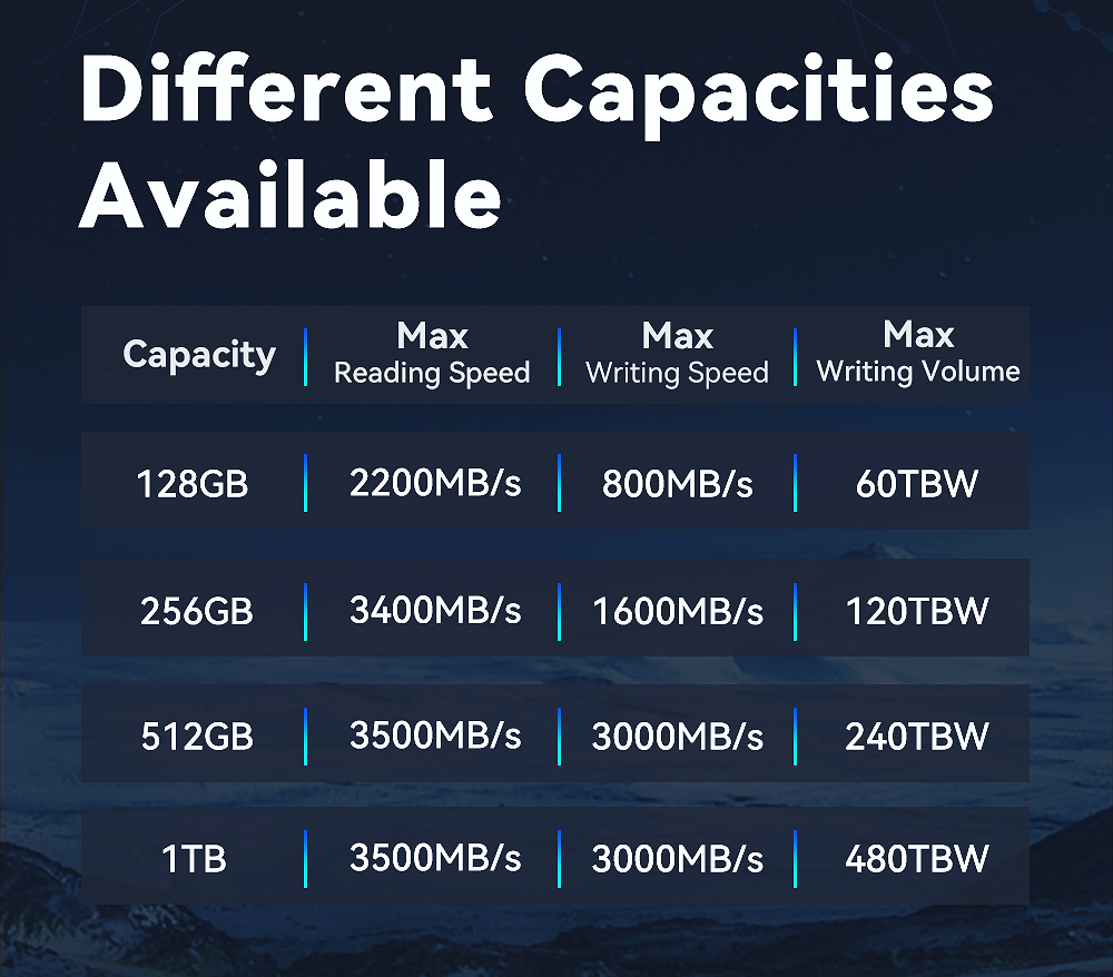 Með leshraða upp að 3500 MB/s og skrifhraða upp að 3000 MB/s, tryggir þessi SSD hraða ræsingu, hnökralausan fjölvinnslu og hraðar skráarfærslur. Knúið af 3D NAND flash tækni, jafnvægi milli hraða, endingar og skilvirkni fyrir daglega tölvunotkun og fagleg verkefni.